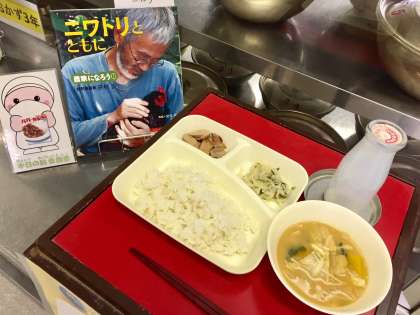 上段の写真は、本日の献立と給食図書です。本日の給食図書は「ニワトリとともに」でした。自然養鶏家さんが自ら育てたニワトリで自給自足をしている様子が載っている図書でした。