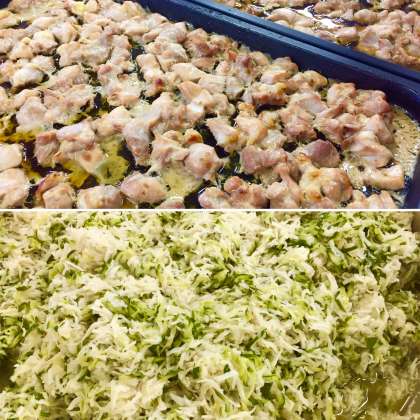 下段の写真は、焼きあがった鶏肉のてり焼きと、出来上がった切り干しだいこんのゆずの香あえです。