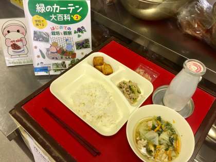 上段の写真は、本日の献立と給食図書です。本日の給食図書は「緑のカーテン大百科2」でした。夏の暑い時期に、ゴーヤやヘチマ等つる性の植物を窓の外に植える取り組み「緑のカーテン」の作り方が載っている図書でした。
