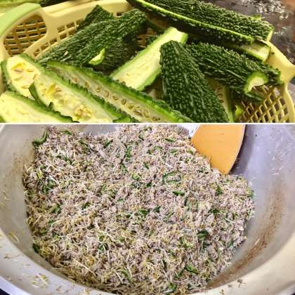 下段の写真は、調理中のにがうり(ゴーヤ)と、出来上がったゴーヤチャンプルーです。にがうりは、塩で下味をつけることで苦味をやわらげています。