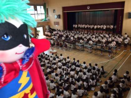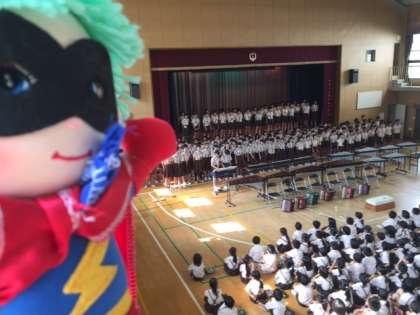 朝の児童集会では、6年生が音楽の発表をしました。器楽合奏で「ラバーズ・コンチェルト」と合唱で「あすという日が」の二曲でした。聞いている1〜5年生の子どもたちは、「とても上手でした」「リコーダーも、歌声もとてもきれいでした」と感心していました。Super Franceも同じように感心して聞いていました。