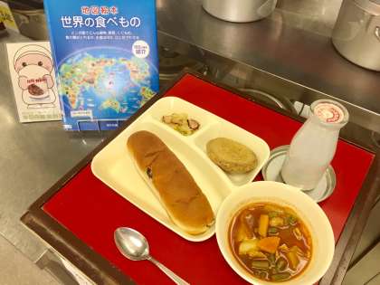 上段の写真は、本日の献立と給食図書です。本日の給食図書は「地図絵本 世界の食べもの」でした。世界各地の野菜や食肉、魚介類等の産地を地図上に表している図書でした。なお、本日使用したたこはモーリタニア産でした。