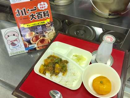上段の写真は、本日の献立と給食図書です。本日の給食図書は「カレー大百科」でした。カレーに使われるスパイスの種類や、世界の各地の色々なカレーが載っている図書でした。