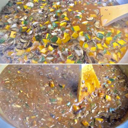 下段の写真は、夏野菜のカレーを調理している様子です。