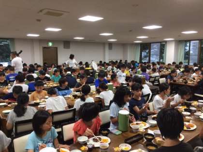 7月23日(日)宿舎の名色ホテルに着いて、開舎式や避難訓練をした後、川で魚つかみをしました。取った魚はすぐに塩焼にして食べました。スイカも食べて、宿舎に帰り、お風呂に入りました。