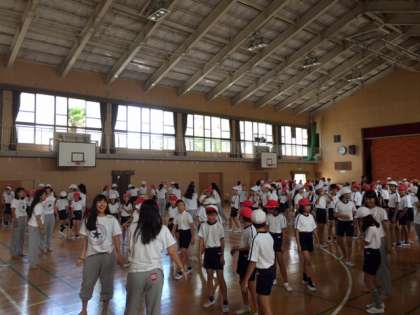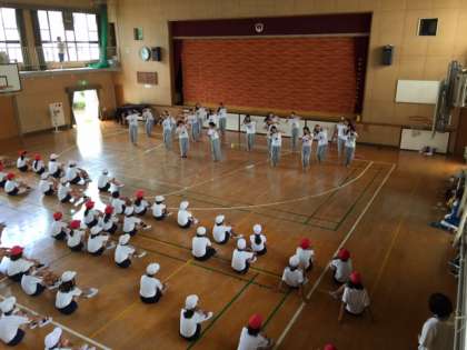 また、今日は鶴見区の出前授業で、汎愛高校ダンス部の皆さんが来校して6年生にダンスを指導してくれました。初めにダンス部の皆さんのコンテスト用の素晴らしいパフォーマンスを見て6年生はまずびっくりしていました。次に6年生が昨年度の学習発表会で演じた「スリラー」を踊って高校生に見てもらいました。それから6年生は少人数のグループに分かれてそれを高校生が手分けして教えるという形で「背中越しのチャンス」の曲に合わせてダンスの練習をしました。最後にみんなで一緒に踊りました。6年生は「ダンスは難しかったけど、楽しかったです。」と言い、高校生は「小学生が一生懸命踊ってくれて私たちも嬉しかったです。」と言っていました。汎愛高校ダンス部の皆さん、本当にありがとうございました。