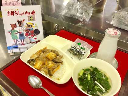 上段の写真は、本日の献立と給食図書です。本日の給食図書は「お母さんのいない夜」でした。こどもたちだけでも料理が作れるように、料理の作り方が絵でわかりやすく載っている料理の図書でした。