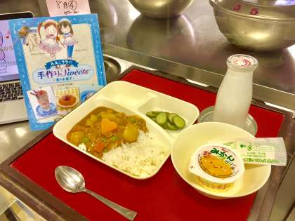 上段の写真は、本日の献立と給食図書です。本日の給食図書は「ルルとララの手作りスイーツ」でした。アイスクリームやゼリー等、夏にぴったりのお菓子の作り方が載っている料理の図書でした。