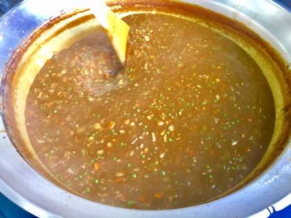 中段の写真は、チキンカレーライスを煮込んでいる様子です。