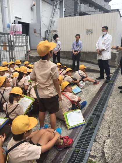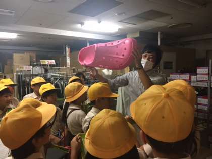 今日の見学では、3年生の子どもたちはバックヤードにまで入れてもらって、お肉をトレイに入れて自動でラップし値札をつける様子や、天井から大きなサンダルのサンプルをぶら下げてお客さんを集める工夫などを見学しました。