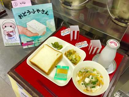 上段の写真は、本日の献立と給食図書です。本日の給食図書は「おとうふやさん」でした。商店街の豆腐屋さんのとうふの作り方が載っている絵本でした。
