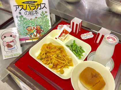 上段の写真は、本日の献立と給食図書です。本日の給食図書は「アスパラガスの絵本」でした。アスパラガスの種類や育て方が載っている絵本でした。