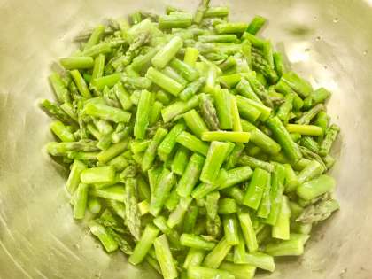 下段の写真は、蒸しあがったグリーンアスパラガスです。