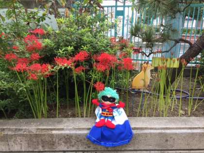 玄関には、ヒガンバナがきれいに咲いています。この時期になると、4年生の国語の教科書から「ごんぎつね」が、ヒガンバナを見に鶴見南小学校にやってきます。今年はさらにフランスのJules Ferry小学校から来ているSuper France君も、日本の秋を楽しんでいます。本校での様子を写したアルバムを、もうすぐフランスに送る予定です。フランスの子どもたちは、ヒガンバナやごんぎつねを見てどう思うでしょうね?