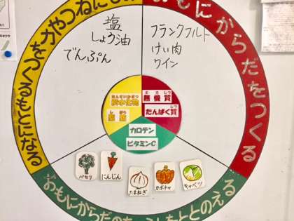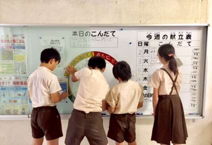 給食委員が毎日の給食献立や食育に関する掲示物を掲示しています。明日の献立の食材を赤、黄、緑の3つの食品群に分けたり、1週間分の献立を記入したりしています。給食献立ボードにはそのほかに、給食ニュースや食育に関する資料も掲示されています。