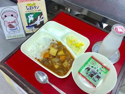 本日の献立は「ハヤシライス・野菜サラダ・ソフト黒豆・牛乳」でした。