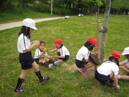 前日の雨が嘘のようにお天気も回復し、子ども達も大喜びで出発しました!!寝屋川公園の広い芝生では、友だちとおにごっこ、はないちもんめ、だるまさんがころんだ、大なわ跳び、ドッジボール、フリスビー、春見つけ、草花遊びなどをして、思い思いに楽しく遊ぶことができました。中には、練習をしている方のフルート演奏に聴き入っている子もいて、和やかな雰囲気でした♪