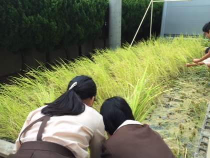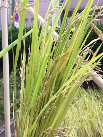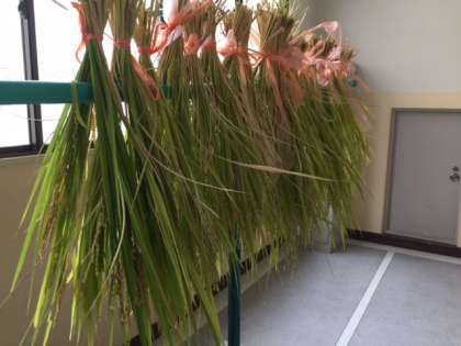 刈り取ったイネは、農村の風景のように家庭科室前に干しています。この後、脱穀をして、家庭科の調理実習「ごはんとみそ汁」のときに、他のお米と合わせて炊飯し、食べる予定です。5年生の子どもたちは「早く食べたいな」と今から楽しみにしています。