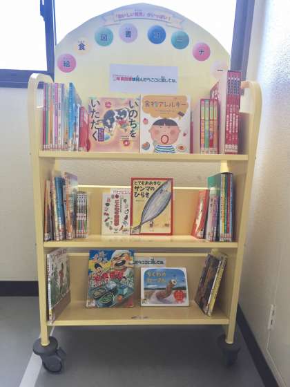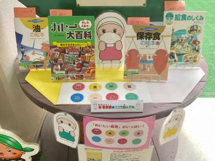 玄関ホールには、今週の給食図書を展示しています。本日の給食図書は給食終了後、玄関の給食図書コーナーに展示しています。また、それぞれの給食図書は、学校ホームページの「本日の給食献立」でも紹介しています。