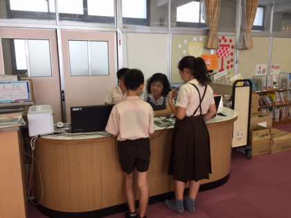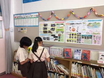本校の学校図書館には、2学期から図書館司書の先生が入っています。図書の時間に本を借りたり返却したりするのを手伝ったり、テーマごとに図書を整理したり特集を組んだり、時には担任と打合せをして、国語教材に関するブックトークをしたりしてくださっています。金曜日には図書館補助員も入っているので、本校の子どもたちはいつでも図書館を利用できます。今年の秋も、ぜひたくさんの本に親しんでほしいですね。
