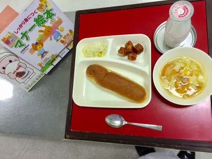 上段の写真は、本日の献立と給食図書です。本日の給食図書は「しっかり身につく マナー絵本」でした。食べる時や学校や家での過ごす時のマナーがわかる絵本でした。