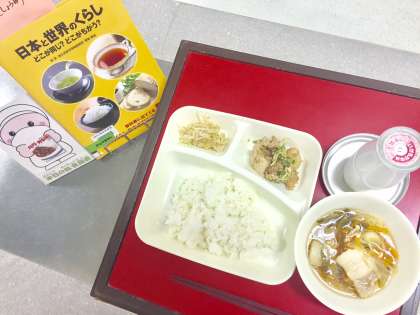 上段の写真は、本日の献立と給食図書です。本日の給食図書は「日本と世界のくらし どこが同じ?どこがちがう?」でした。ごはんとパン、はしとフォーク・ナイフ等、日本と世界の国々の食文化の違いが載っている図書でした。