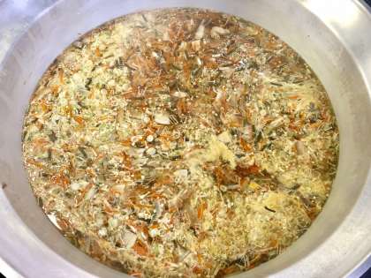 ソーキ汁は、けずりぶしで取っただしに、切りこんぶ、豚バラ肉、にんじん、だいこん、白ねぎ等が入った、汁物献立でした。「ソーキ」とは沖縄で「骨つきの豚バラ肉」のことです。