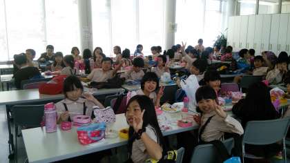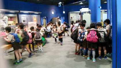 4月25日(金)、春の暖かい陽ざしの中、校外学習に行ってきました。午前中は、大阪市立科学館で、春の一日の太陽の動きと惑星、そしていろいろな星座の見つけ方を教えていただきました。映像で、大阪の町の照明を全部消した時の夜空を見た途端、こぼれそうなほどの星・星・星!!子どもたちは、大歓声を上げていました。