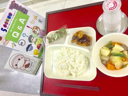 上段の写真は、本日の献立と給食図書です。本日の給食図書は「5つの栄養素 なんでもQ&A」でした。「種なしぶどうがどうして種がないのか」や「ピーマンがどうして苦いのか」等、食べものに関する疑問の答えが載っている図書でした。