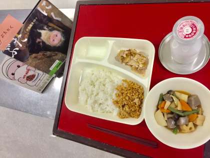 本日の献立は「豚肉のねぎだれかけ・ふきよせ煮・ツナ大豆そぼろ・ごはん・牛乳」でした。