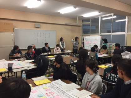 授業後の研究討議会では、教員で今回の取り組みの成果と課題について、ワークショップ形式で話し合いました。指導助言の坪田秀雄先生からも成果と課題について教えていただきました。