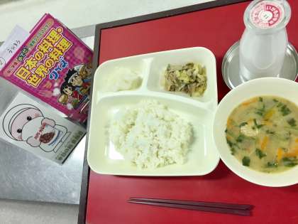 本日の献立は「豚肉とまいたけのいためもの・つみれ汁・ういろう・ごはん・牛乳」でした。