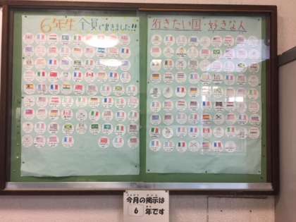 6年生は、11月の「掲示板」に、外国語活動の関連で「行ってみたい国」、社会科学習の関連で「歴史上で好きな人」を書きました。他学年の人も立ち止まってよく読んでいます。次の土曜授業のときにでもぜひご覧ください。