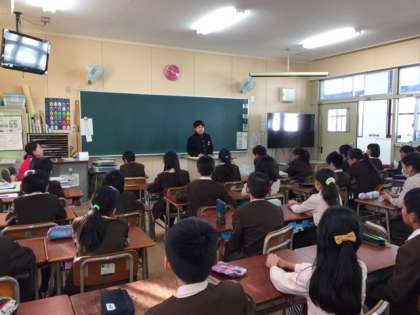 昨日、緑中学校の生徒会役員が来校して、6年生の各クラスに入り、12月1日に緑中学校で行われる「小中連携部活動体験」のアンケートの説明をしてくれました。いずれも本校の卒業生でしたが、礼儀正しくかつ温かい態度を見て、6年生も安心して応えていました。