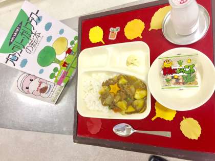 ビーフカレーライスは、牛肉、セロリー、にんじん、たまねぎ、グリーピースが入った児童に人気の献立でした。カレールウには星型のラッキーにんじんが入っていました。