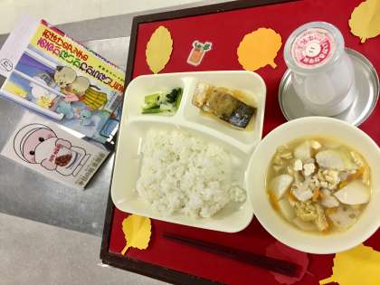 本日の献立は「さごしのおろしじょうゆかけ・けんちん汁・こまつなとはくさいの甘酢あえ・ごはん・牛乳」でした。
