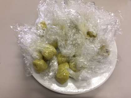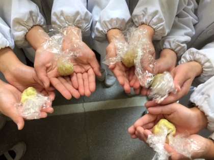 初めにふかしたおいもをボウルに入れて、牛乳と砂糖を加え、グループのみんなで協力して混ぜました。次に適量ずつラップに分けて包んで「スイートポテト」の出来上がりです。