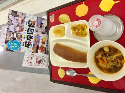 上段の写真は、本日の献立と給食図書です。本日の給食図書は「厨房図鑑」でした。ピザ屋さんやパン屋さん、ケーキ屋さん等、食べ物屋さんの厨房が写真で説明されている図書でした。