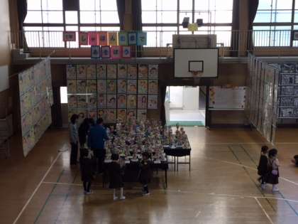 1年生は平面(絵画)が「しゃぼん玉であそぼう」、立体(工作)が「キラキラパフェやさんにようこそ」のテーマで展示しています。2年生は平面が「生きものなかよし大作せん」、立体が「おしゃれなケーキやさん」です。3年生は平面が「虫と遊ぼう 夕やけの風けい」、立体が「クリスタルファンタジー」です。どの学年も、楽しく、かわいい作品を作っています。