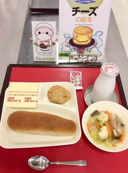 上段の写真は、本日の献立と給食図書です。本日の給食図書は「チーズの絵本」でした。世界中のいろいろな種類のチーズや作り方が載っている絵本でした。