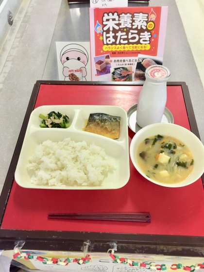 本日の献立は「さばのみぞれかけ・みそ汁・こまつなのいためもの・ごはん・牛乳」でした。
