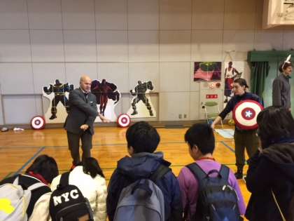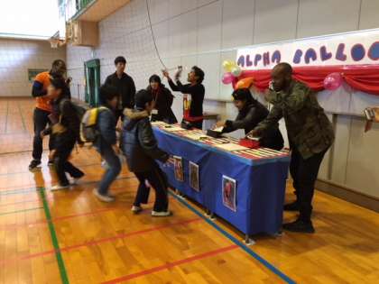 受付で名札をもらって、順に体育館に入るとレッドカーペットが敷いてあって、両側に約100名のC-NETが迎えてくれる中を、ハイタッチをしながら入場しました。初めに大阪市教育委員会から「今日は積極的に英語活動を楽しんでください」というご挨拶がありました。ここからはすべて英語で「今日はアカデミー賞の候補を探します。6つのコーナーを回って楽しく活動しましょう。」というお話がありました。