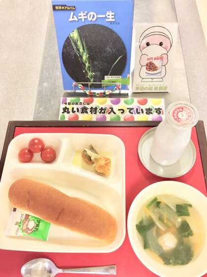 上段の写真は、本日の献立と給食図書です。本日の給食図書は「ムギの一生」でした。麦畑の一年間を通して、麦の成長や栄養について書かれた図書でした。