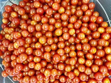 下段の写真は、ヘタを取って洗浄されたプチトマトです。