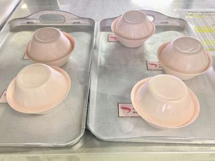 下段の写真は、えびを除去した個別対応のスープのお椀です。お椀の色と食札で普通食と見分けがつくようにしています。