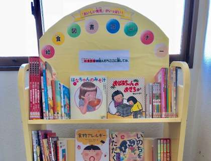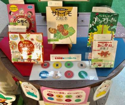 玄関ホールには、今週の給食図書を展示しています。その給食図書は給食終了後、玄関の給食図書コーナーに展示しています。それぞれの給食図書は、学校ホームページの「本日の給食献立」でも紹介しています。