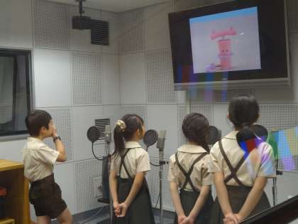 「わいわいスタジオ」では声優体験をしたり、ニュース番組を作成したりしました。