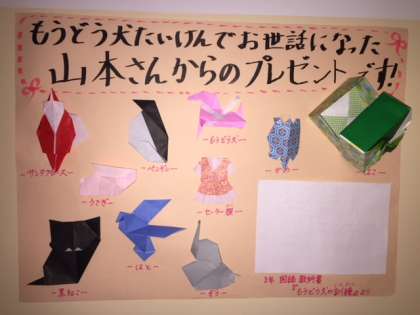3年生は昨日、山本さんに盲導犬等についてお話を聞きました。山本さんは、自分で折ったサンタやペンギン等の折り紙や、国語の教科書を点字で打ったものをプレゼントしてくださいました。廊下に掲示していると、3年生だけでなく他の学年の子どもたちも「すごいなー」と感心していました。