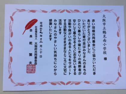 大阪府共同募金会からは、先日本校で行った共同募金の感謝状が届きました。いろいろなサポート活動に使われるそうです。また総額がわかったらお知らせします。