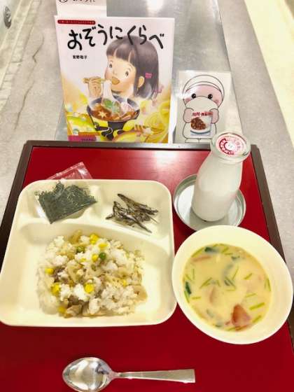 上段の写真は、本日の献立と給食図書です。本日の給食図書は「おぞうにくらべ」でした。主人公のきみちゃんが各地のいろいろなおぞう煮に出会う絵本でした。